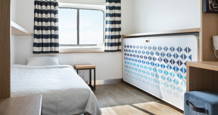A-hytt (11 m2) med havsutsikt. Hytterna har plats för upp till 4 personer och ligger på däck 5, 8, 9, 10 och 11. Tillgång till handikappanpassade och djurvänliga A-hytter finns.