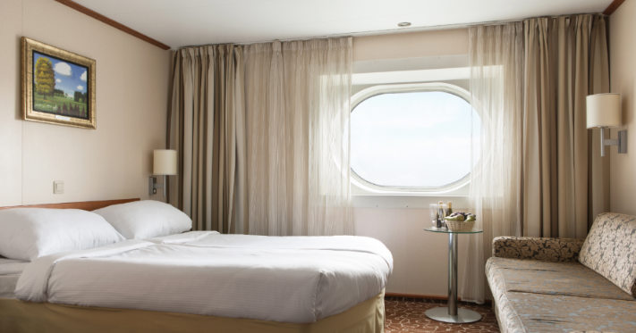 DeLuxe-hytt (11–14 m²) med havsutsikt. Specialfrukost inklusive ett glas mousserande vin ingår och serveras i en av à la carte-restaurangerna (tider för frukost hittar du ombord). Hytten har plats för 2 personer + 1 barn (0–5 år) som sover i föräldrarnas säng och ligger på däck 8 och 9.