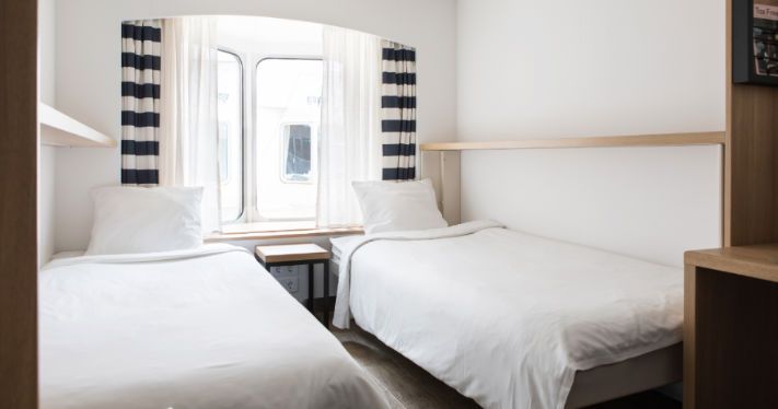 Här finns information om hytter ombord. I priset ingår B-hytt. A-hytt, Promenade-hytt och Delux-hytt kan väljas som tillval i bokningen.